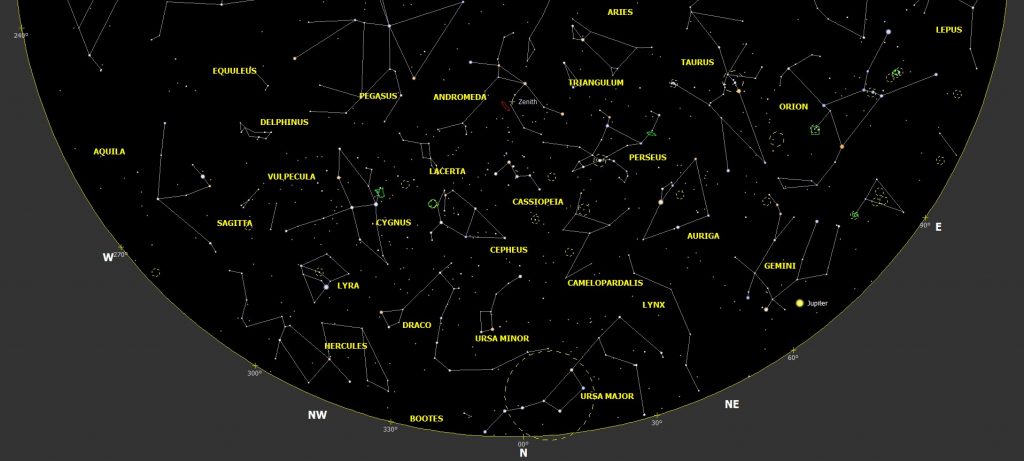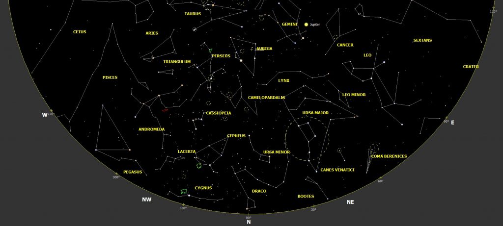 A continuación, se reflejan cuatro mapas, dos para la primera parte de la noche (orientaciones norte y sur) y otros dos para el cielo de madrugada (id orientaciones) obtenidos del programa «Cybersky 5.0.3» y calculados para el día 15 del mes.