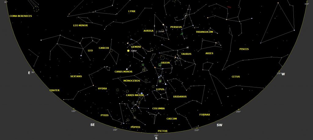 Júpiter resplandece cada vez más, dada la cercanía de su oposición del 10 de enero. Con  mg. -2,6 se sitúa en Géminis, moviéndose de forma retrógrada