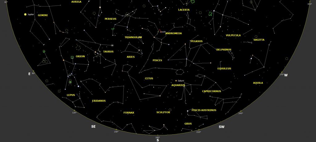 En esta época sigue siendo visible el cúmulo de galaxias del Escultor, con galaxias tan notables como la famosa “Moneda Plateada”, la espiral NGC 253. También por la zona podemos observar otras galaxias como NGC 55, 247 y el globular NGC 288