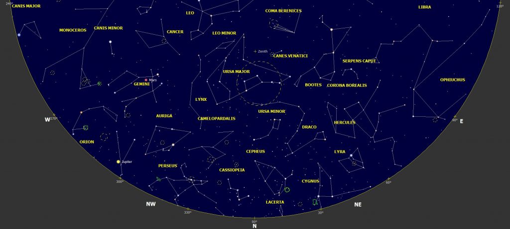 A continuación, se reflejan cuatro mapas, dos para la primera parte de la noche (orientaciones norte y sur) y otros dos para el cielo de madrugada (id orientaciones) obtenidos del programa «Cybersky 5.0.3» y calculados para el día 15 del mes.
