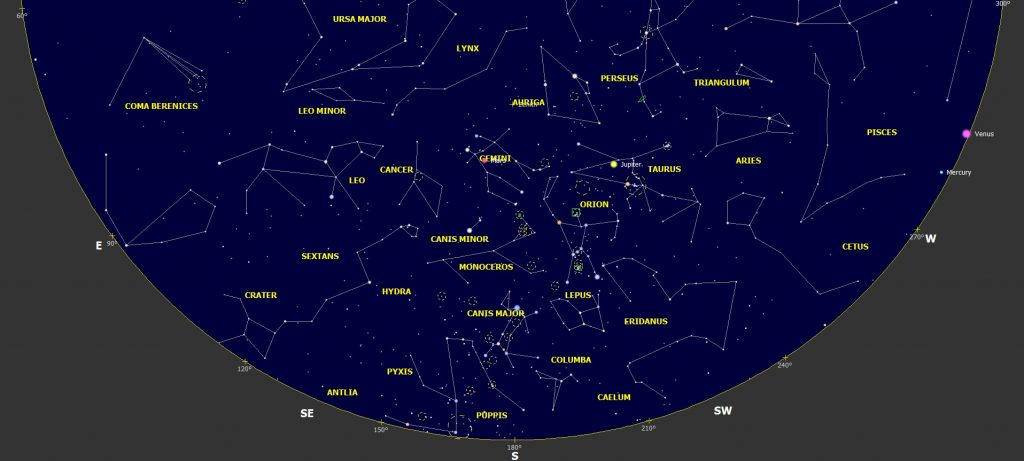 Venus, resplandece en el cielo del atardecer, con mg. -4,5 en Piscis; durante el mes va perdiendo altura, hasta quedar inmerso en el brillo del crepúsculo hacia el día 20. A partir de ese momento, comienza a ser visible en el cielo del amanecer con mg. -4,1 y ganando altura hasta finales de mes.