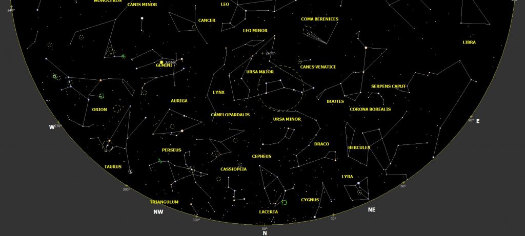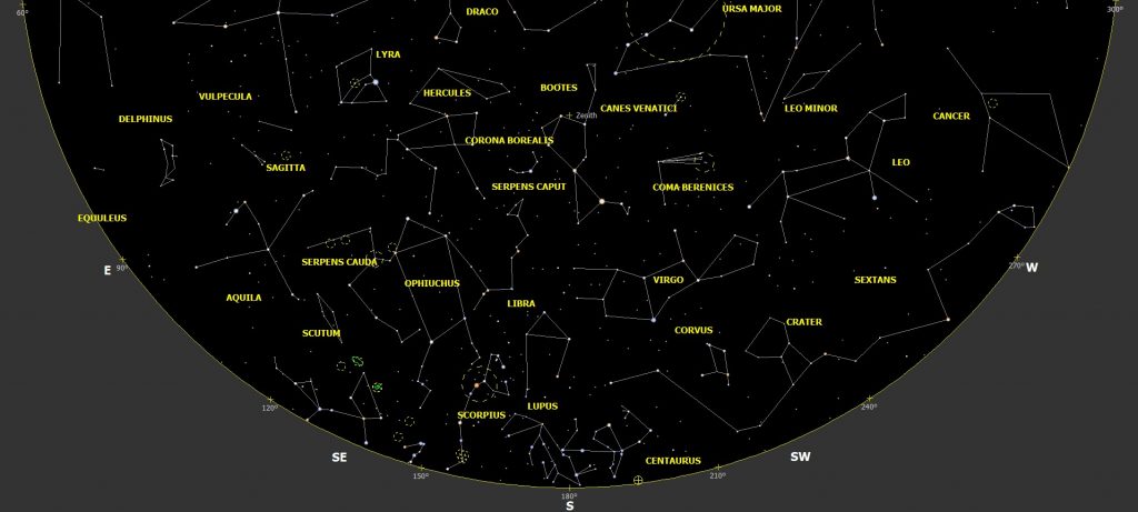 A continuación, se reflejan cuatro mapas, dos para la primera parte de la noche (orientaciones norte y sur) y otros dos para el cielo de madrugada (id orientaciones) obtenidos del programa «Cybersky 5.0.3» y calculados para el día 15 del mes.
