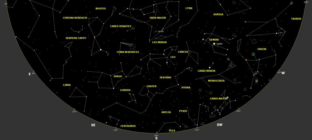 Júpiter, es visible casi toda la noche, con mg. -23 en el centro de la constelación de Géminis; a finales de mes se pone a primera hora de la madrugada. Siguen siendo visibles todo tipo de eventos entre sus satélites, con eclipses y ocultaciones, etc; se pueden consultar las efemérides de los eventos con cualquier planetario de ordenador como Stellarium y/o Sky Safari Pro.
