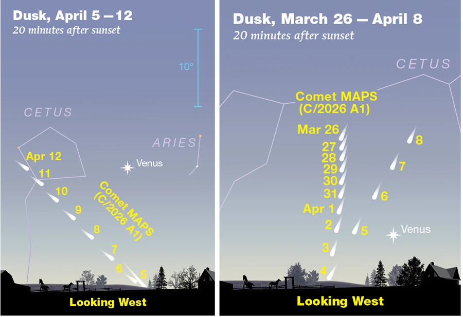 OJO, QUE A PRIMEROS DE MES, SI EL COMETA C/2026 A1-MAPS SOBREVIVE A SU ENCUENTRO CON EL SOL, SERÁ NUESTRO PUNTERO EN LA PRIMERA SEMANA DEL MES PARA LOCALIZAR AL COMETA.