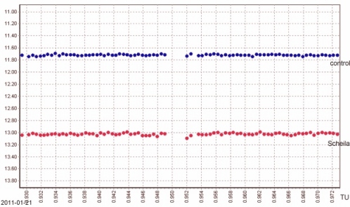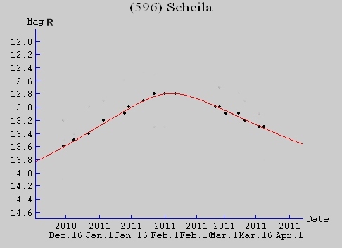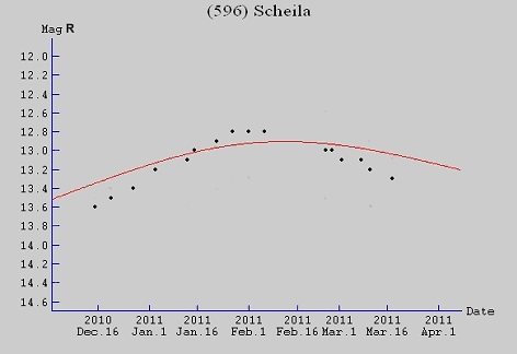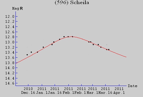La revisión de imágenes atrasadas revelaban que el día 3 de diciembre el asteroide se mostraba algo difuso. Por lo tanto, parece que este evento comenzó algunas horas antes del 3 de diciembre. Se creé que lo que acabamos de presenciar son las consecuencias de una colisión de Scheila y, un objeto pequeño, tal vez de unos treinta metros de tamaño. Los dos arcos visible que se pueden observar en la imagen son muy parecidos a los detectados por el cometa P/2010 A2 Scheila es un asteroide de gran tamaño (diámetro ~ 113 km) situado en las regiones exteriores del cinturón principal, tiene una superficie oscura (albedo = 0,038). Un período de rotación de 15,8 horas ha sido calculado y la amplitud de su curva de luz (0.09 mag) se deduce que es de forma esférica. Del mismo modo su órbita es, sin duda la de un asteroide. ![]() ![]() Vigilancia fotométrica de Scheila Las observaciones de la evolución de la coma, alrededor (596) Scheila puede discriminar entre la hipótesis de una colisión y la de un cometa durmiente o inactivo. En efecto, la fotometría del núcleo del asteroide pone de manifiesto que su brillo no cambia los días cercanos al estallido. La curva de luz demuestra que el asteroide sigue la magnitud prevista para un asteroide y no para un cometa. (Figura 1 y 2) ![]() ![]() Conclusión El asteroide ha podido sufrir un impacto con otro objeto más pequeño excavando un cráter en Scheila. El aumento de brillo en la fotometría 10"x10" y la coma observada ha sido por la nube de polvo que ha permanecido durante algunos días alrededor del asteroide. Diego Rodriguez Guadrrama Observatory MPC 458 25-3-2011 |